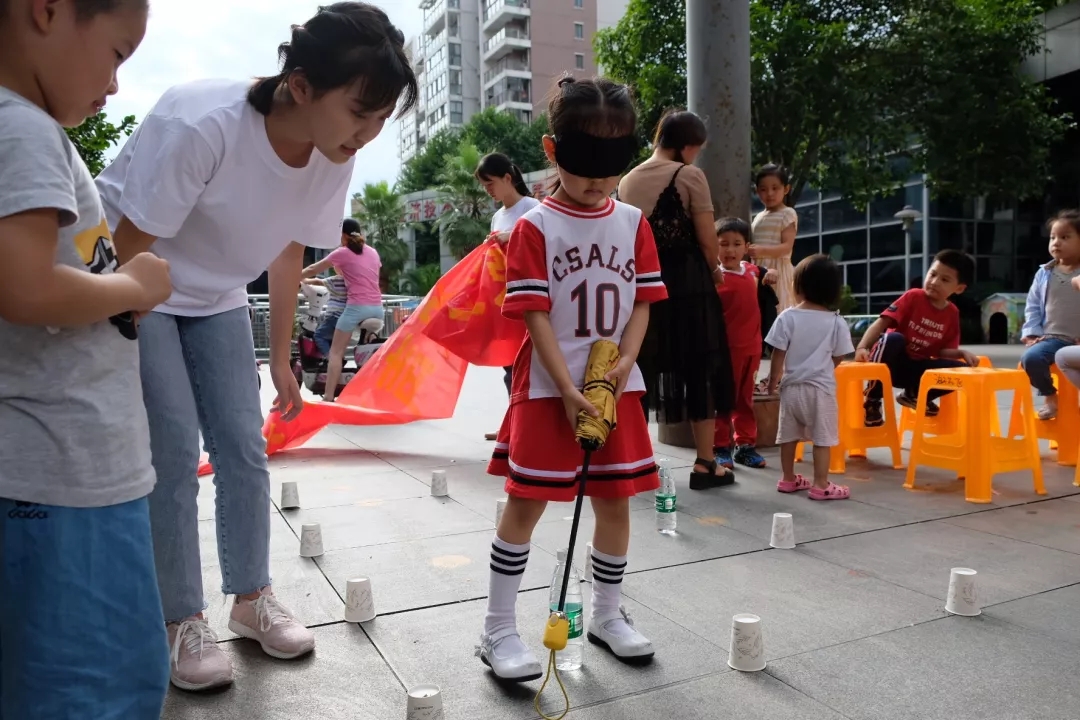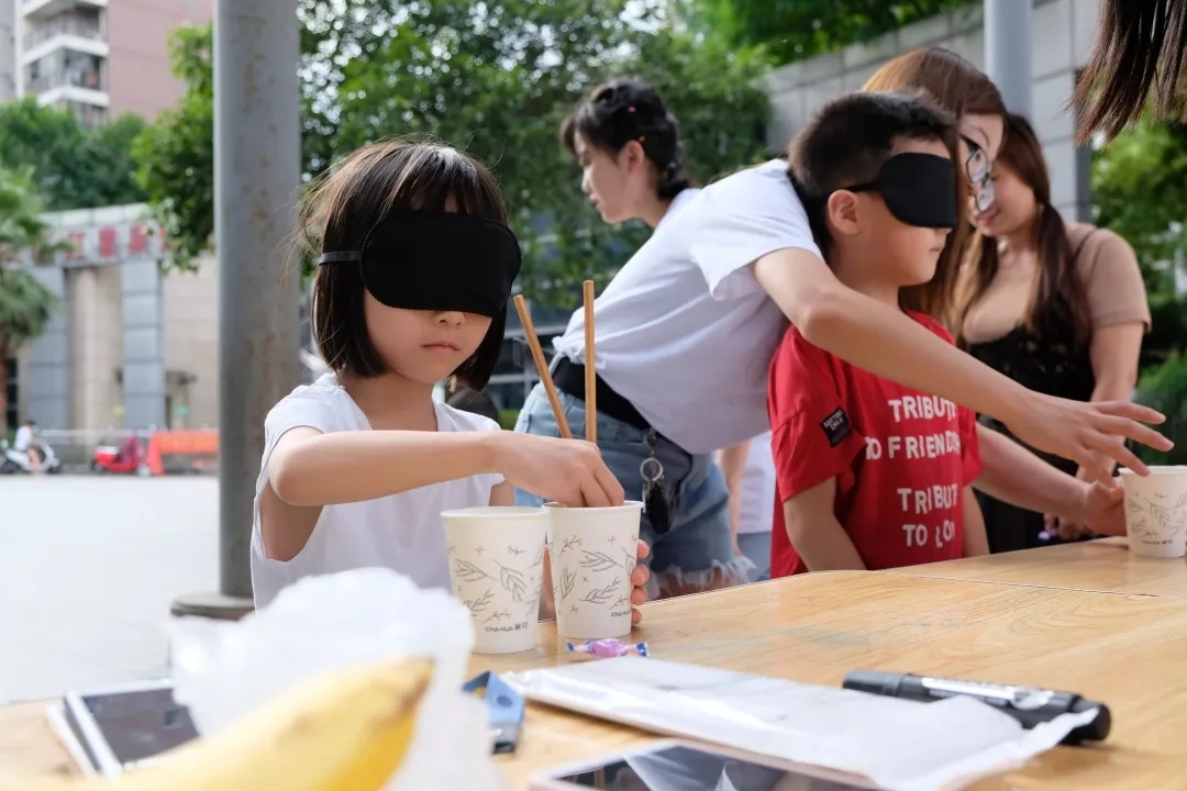 第二个游戏是走盲道后夹纸团。小朋友们戴好眼罩后通过使用盲杖,走过我们设计的模拟道路,然后到达桌子后,用筷子把纸团从一边夹到空碗里。