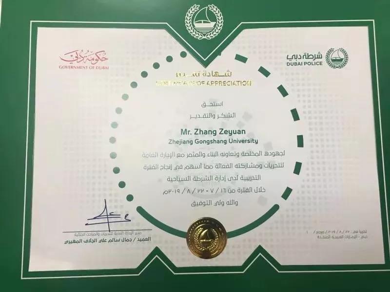 阿语系本着 “以人为本,实践教学”的教学理念,落实培养新时代复合型阿语人才的方针,推荐张泽原前往阿联酋迪拜政府,他才得以拥有这次机会。 在“一带一路”战略的支持下,阿语系致力于培养出色的复合型人才。以语言为根基,诠释做人做事做学问的理念。张泽原作为阿语系的一员,正是在大学两年的沉淀与积累,使他各方面素质都得到锻炼,并圆满完成了本次实习任务,获得了阿方的一致赞赏。他希望在之后沙迦大学留学时期,也一定会发扬“诚毅勤朴”的校训精神,在阿联酋树立商大学子的良好形象。 (来自迪拜政府警察总署的证书)